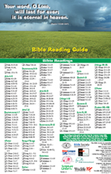 As a practical way of getting started, an easy-to-use Daily Bible Reading Guide has been produced to help each reader on this most rewarding and life-changing journey-reading the Word of God. An order form for churches is found on the Bible Society website www.biblesociety.com.au . The cost is $8.50/50 Reading Guides. A colorful poster with space for adding a date is free to all those who order more than 50 Reading Guides. The Reading Guide may be downloaded and printed for individual use.