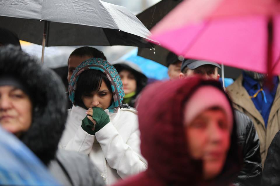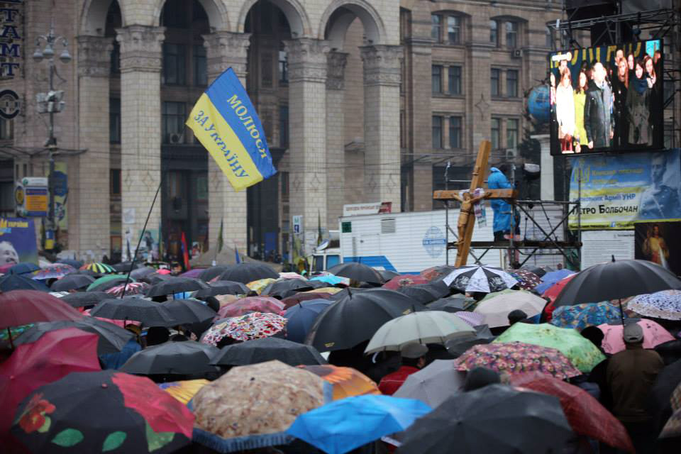 Ukrainians gathered on the Maidan square in central Kiev, and in city squares around the country, for prayer meetings to ask God for His hand to be upon the situation in Ukraine. (Photo by Boris Volkov, Russian Ministries)